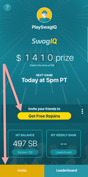 If you invite a friend to play Swagbucks LIVE and they download the app, create a new account and verify their mobile device, you will be awarded one Free Rejoin. You can use your accumulated Free Rejoins once per game to keep playing for the grand prize if you miss a question.